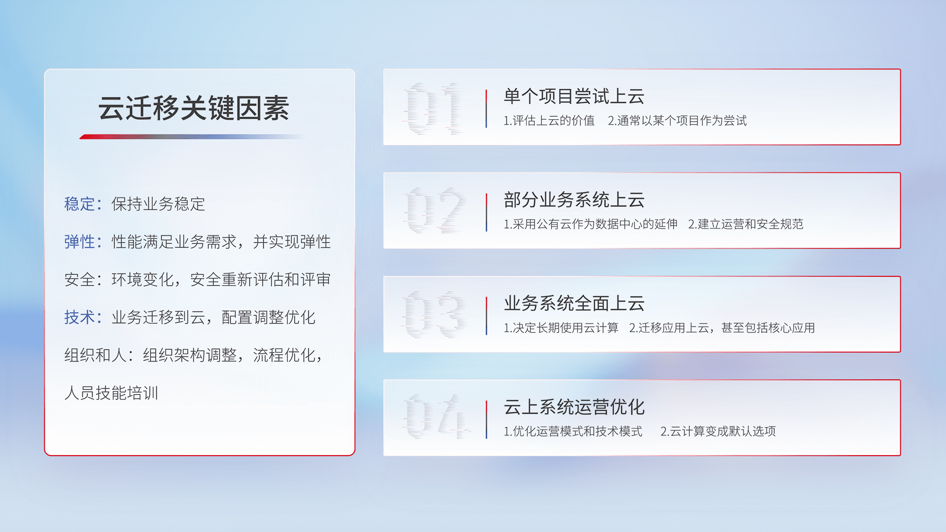 结合实际业务,,,从规划设计、、、、云平台选型、、、、云原生改造、、数据迁移、、集成交付,,,迁移全过程为客户识别最佳上云路径,,做好风险识别管理,,设计网络架构、、、、身份权限、、、安全审计合规、、操作审计、、、日志审计、、、监控告警策略、、多站点容灾设计等,,,,对云上基础设施进行整体规划,,,提升IT治理水平,,以满足弹性、、、、高可用、、、高性能的需求。。。