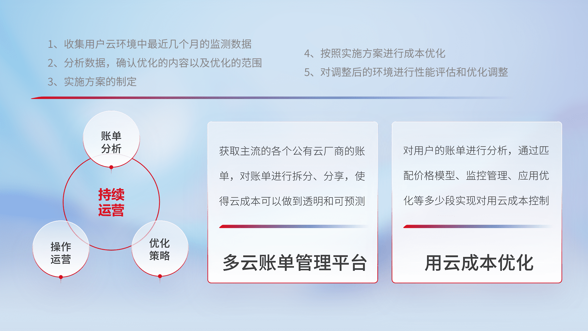 通过多云纳管,,以统一的资源数据模型把客户的云资源进行抽象和封装,,,进而实现对多云资源的统一操作,,,,保障云资源管理的可靠性、、、、稳定性与可用性。。量身定制化运维内容,,配置、、开发运维、、、、补丁管理、、备份、、、监控、、、、认证和访问管理、、审计和日常巡检等,,,保障在用云过程中的可靠度,,稳定度以及高可用率。。。。
